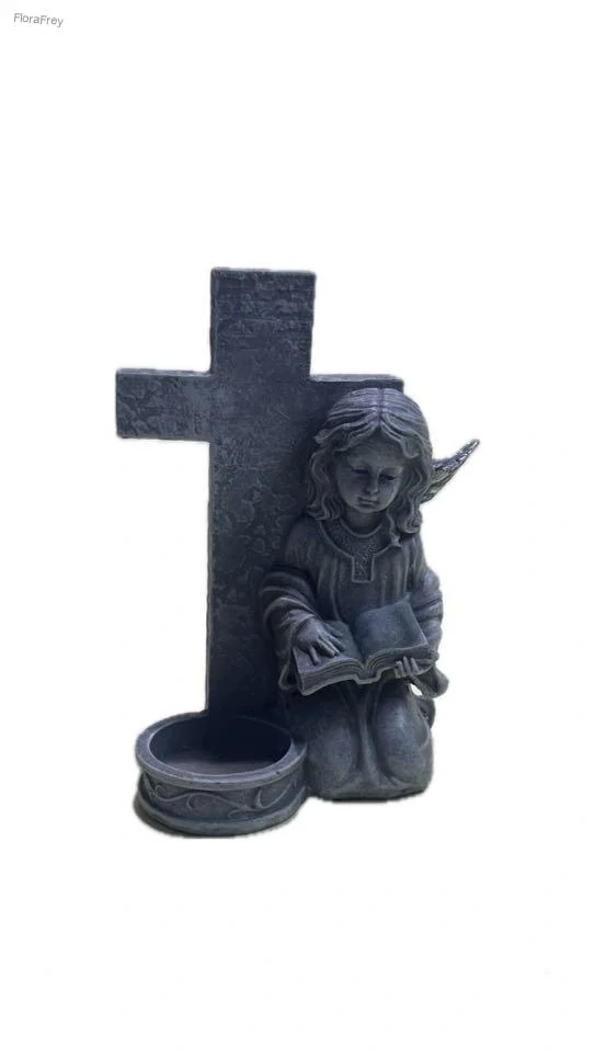 Tato dekorativní soška anděla představuje anděla klečícího u kříže s otevřenou knihou v rukou – symbolem víry, vzpomínek a věčné ochrany. Pod křížem je umístěná misková podložka, do které lze vložit čajovou svíčku nebo malou hřbitovní svíčku, aby celá dekorace získala jemné světlo.