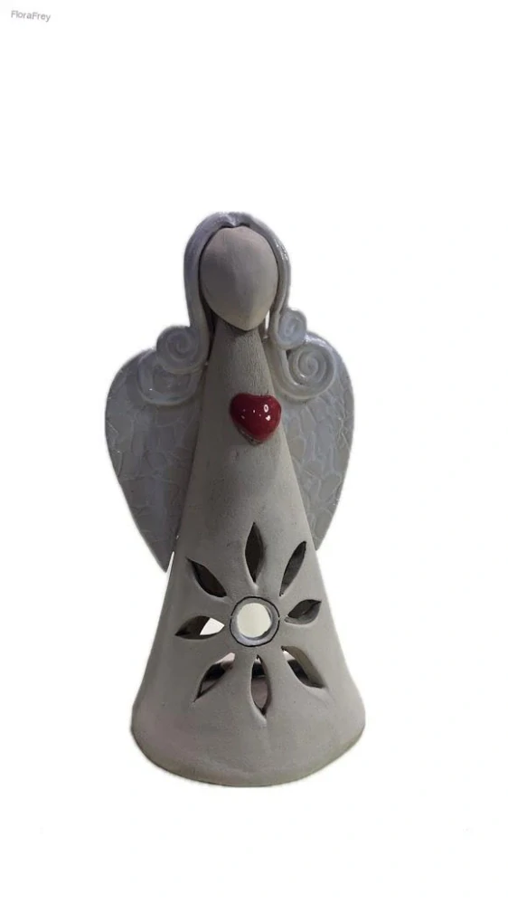 Tento jemný keramický anděl je ručně dekorovaný a působí velmi čistě a elegantně. Na hrudi nese červené srdce – symbol lásky a ochrany. Spodní část figurky je vyřezávaná do krásného květinového vzoru, který umožňuje, aby světlo (např. čajové svíčky či LED světýlek) prosvítalo ven a vytvářelo příjemnou atmosféru.